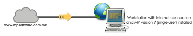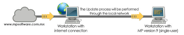 Computer with MP Single User version installed and Internet connection. The MP Update service of the MP, is installed directly in the same computer where MP was installed (See Single User Installation section in the Manual). The MP will take the Updates download directly from this computer.