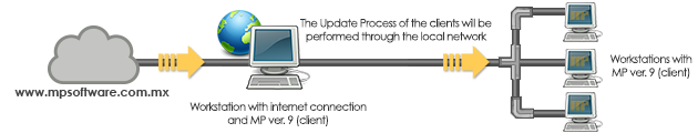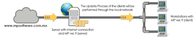 Server with MP Network installed an Internet connection enabled. The MP Update Service is installed directly in the same server where the MP was installed (See the Manual on the MP Network Installation section).The MP Client version installed in the Workstations will take the downloaded updates from the Server.